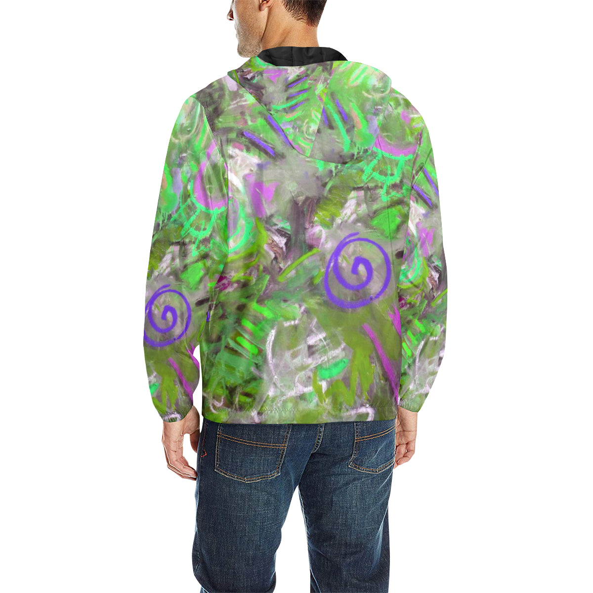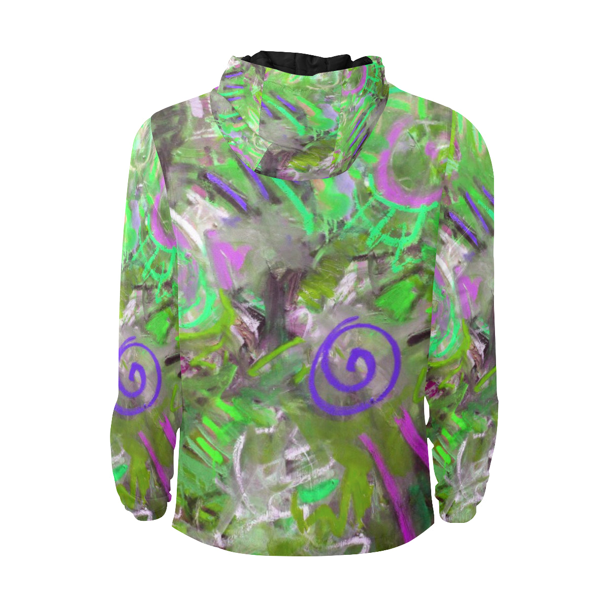 This all over print windbreaker with drawstring hood, elastic cuffs and bottom hem is