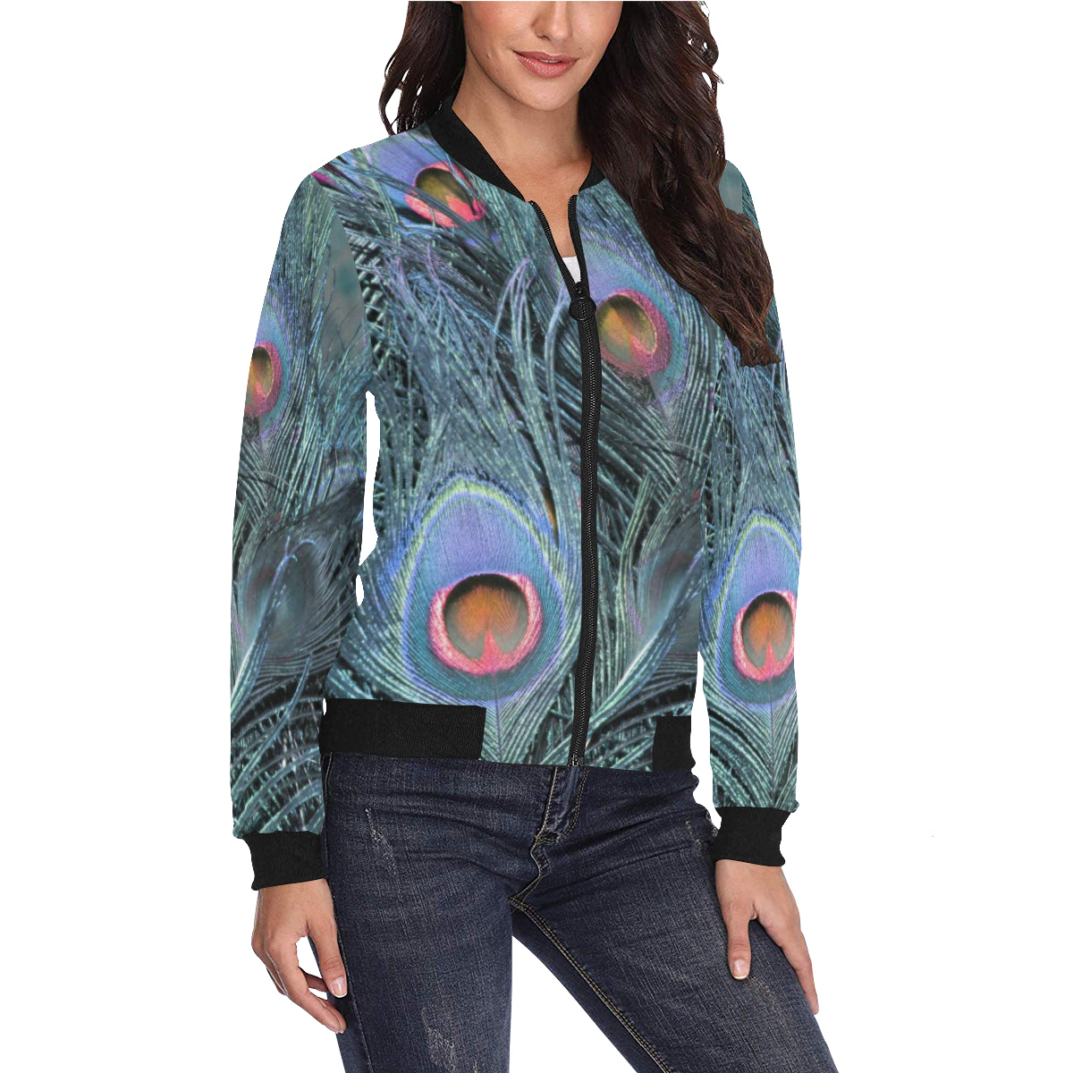Peacock Feathers Blue All Over Print Bomber Jacket for Women (Model H36)