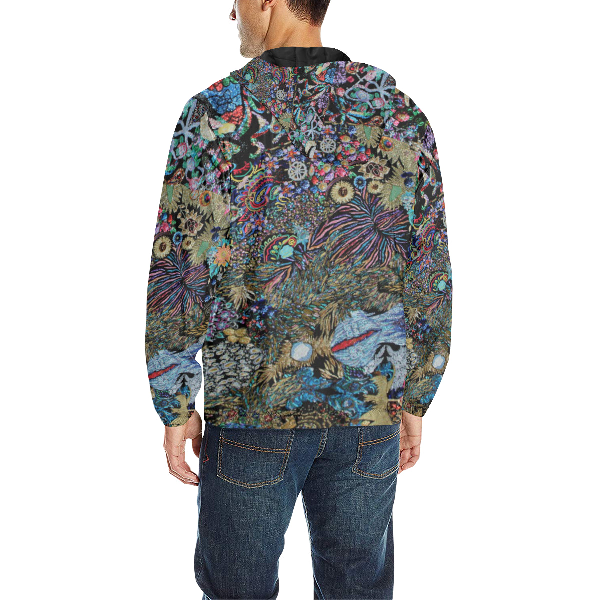 This all over print windbreaker with drawstring hood, elastic cuffs and bottom hem is